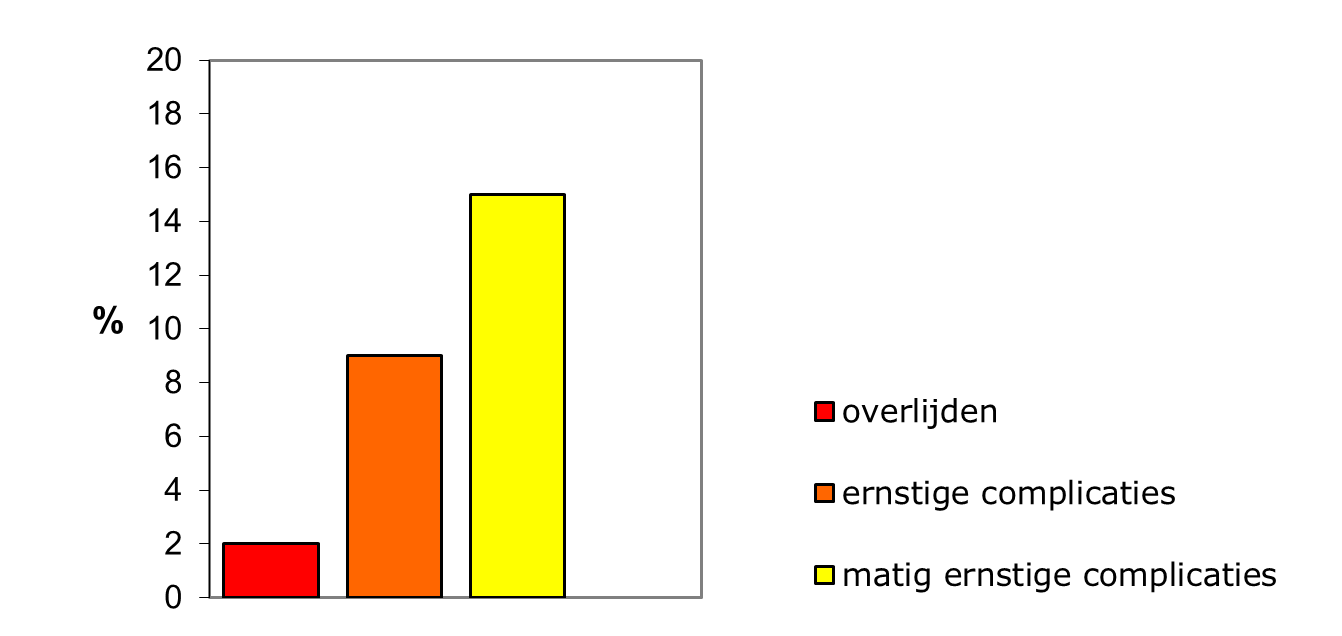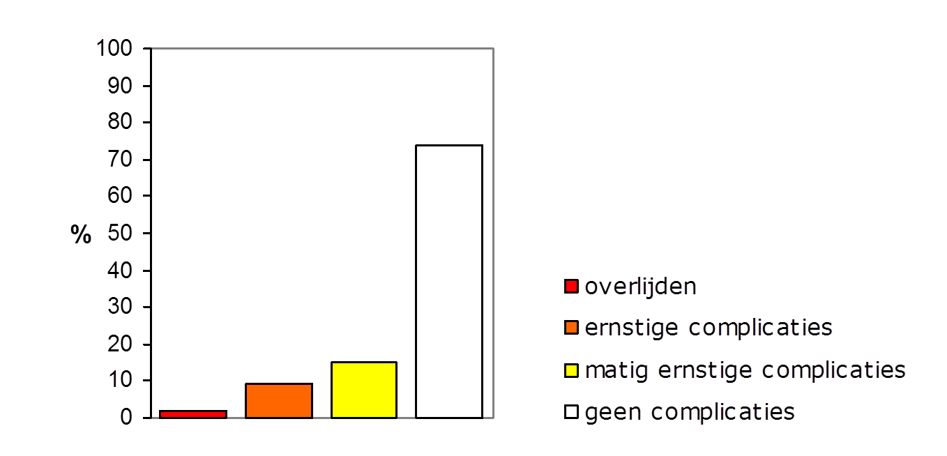 Let er wel op dat de verticale as een schaal tot 100% weergeeft, anders kan er een vertekend beeld ontstaan. Als we bijvoorbeeld de staaf ‘geen complicaties’ weg zouden laten en de verticale as slechts tot 20% zou lopen, lijken de risico’s visueel veel indrukwekkender!