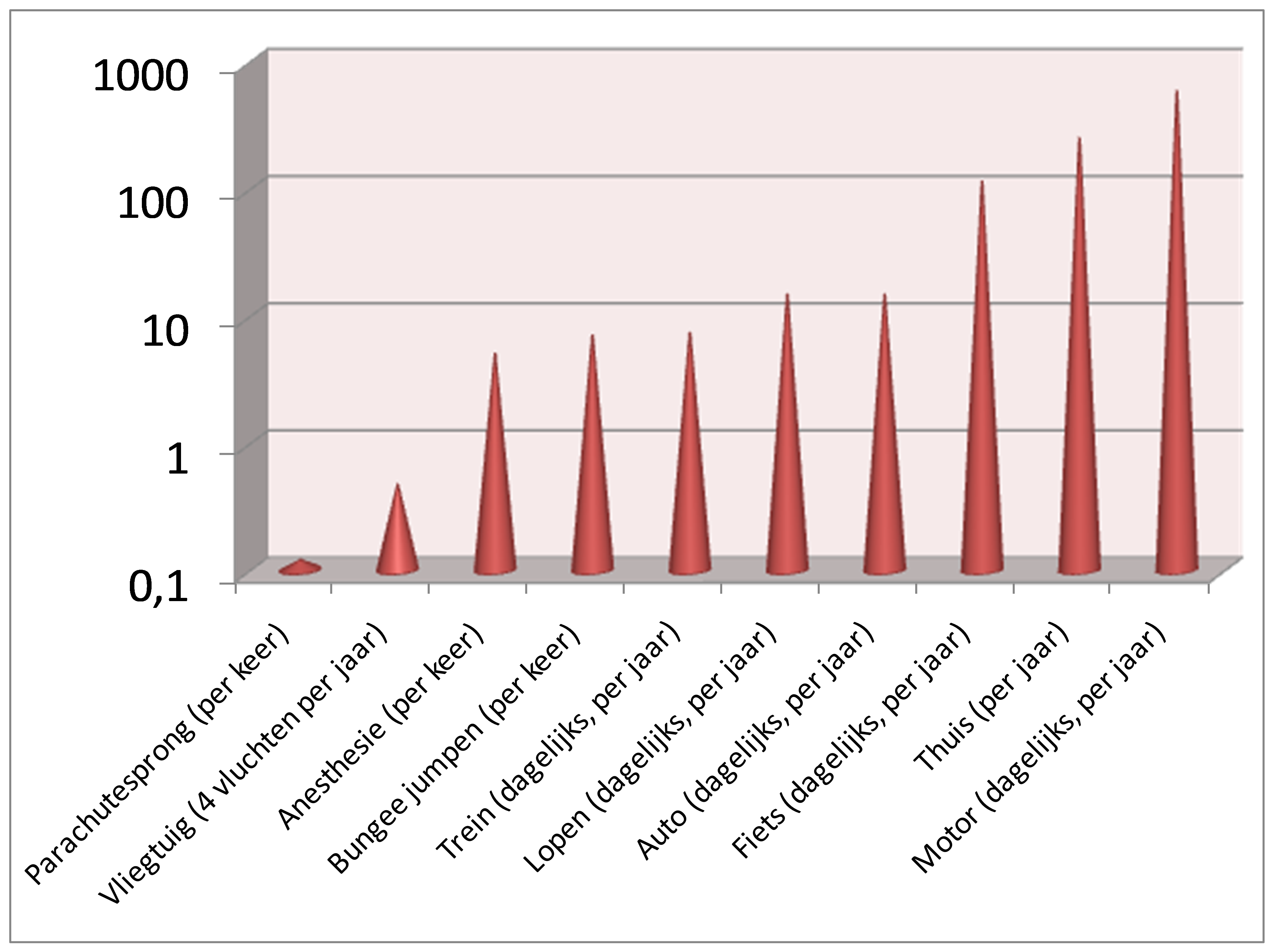 Een goede manier om aan patiënten de grootte van medische risico’s te illustreren is een vergelijking te maken met risico’s in het alledaagse leven. In onderstaand figuur wordt het risico om te overlijden weergegeven bij een aantal activiteiten, waaronder een éénmalige narcose. De cijfers op de verticale as geven de frequentie weer per miljoen mensen.
